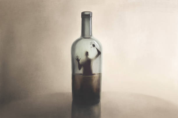 Illustration of man imprisoned in a bottle of alcohol, surreal addiction abstract concept