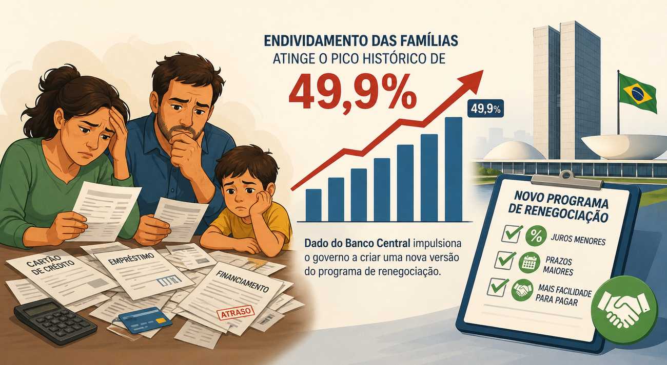 O cenário financeiro dentro dos lares brasileiros atingiu um teto inédito. De acordo com o Relatório de Estatísticas Monetárias e de Crédito do Banco Central, publicado nesta segunda-feira (27), o endividamento das famílias escalou para 49,9%, o patamar mais elevado desde o início da série histórica da instituição. O avanço reflete uma pressão crescente sobre o orçamento doméstico, onde a capacidade de consumo cede espaço para a manutenção de passivos acumulados.
