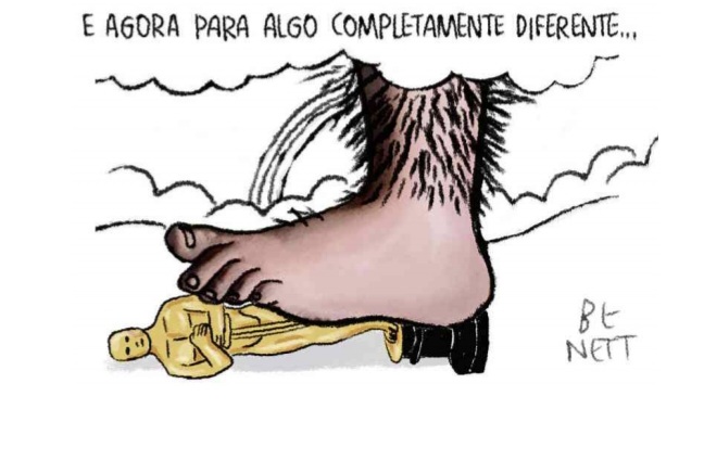 A frase que encima o cartum, “E agora para algo completamente diferente…”, é a dobradiça interpretativa final. Embora remeta ao bordão de transição dos esquetes anárquicos do Monty Python, ela ganha aqui um novo e cortante imperativo. Ela não anuncia apenas um novo esquete, mas uma nova era onde a “alta cultura” e seus prêmios faliram como representantes da experiência humana. O “algo diferente” é o reconhecimento de que, para que o novo emerja, o prestígio artificial dos ídolos antigos precisa ser dissolvido pela desordem libertadora do absurdo. É uma coice de libertação, vindo direto das sombras da nossa própria história.