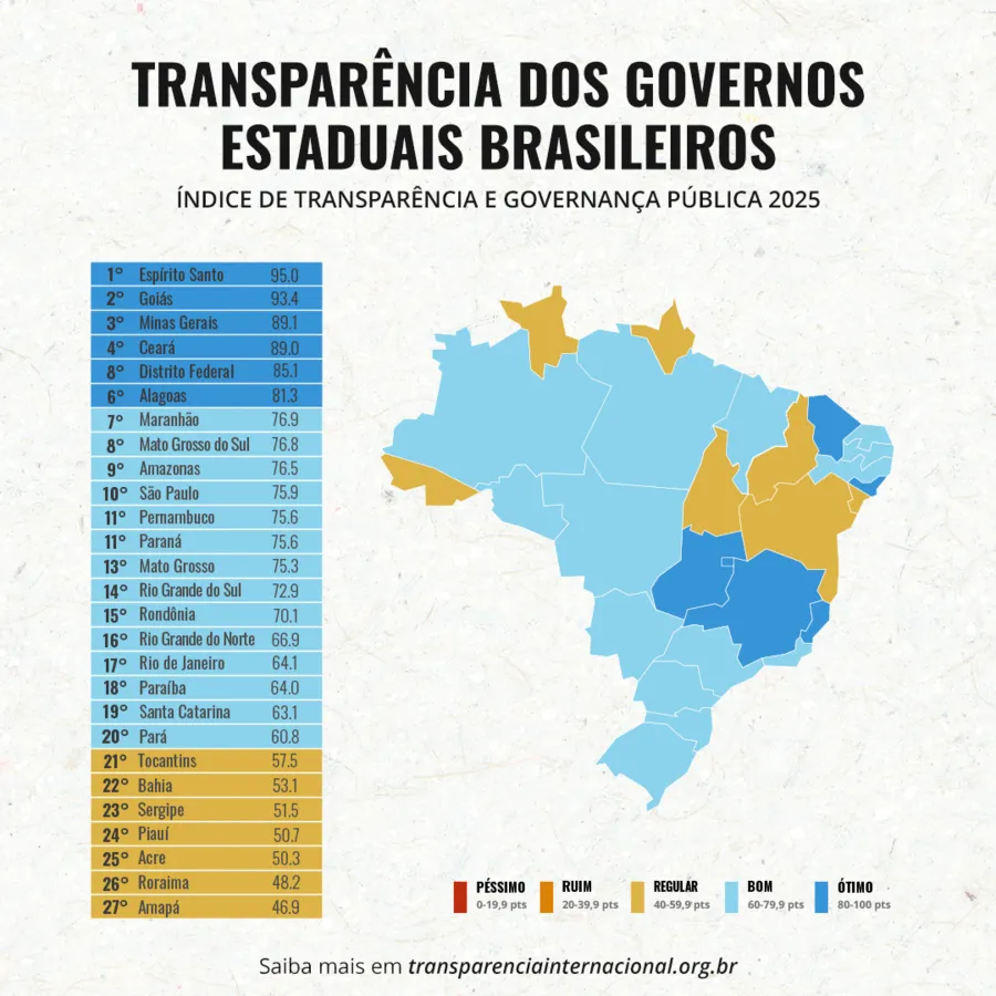 O mais recente levantamento da Transparência Internacional – Brasil, divulgado nesta terça-feira (30), colocou a Paraíba na 18ª posição entre os estados brasileiros no Índice de Transparência e Governança Pública (ITGP 2025). Com 64 pontos, o estado ficou na faixa considerada “boa”, mas o resultado acendeu alerta para falhas na divulgação de informações sobre emendas parlamentares e execução de obras públicas. No Nordeste, a Paraíba aparece em quarto lugar.