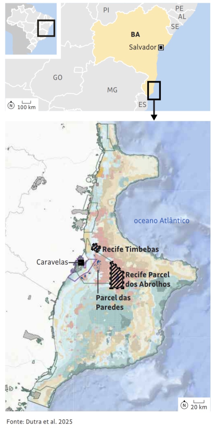 O biólogo Guilherme Dutra, integrante da expedição e pesquisador associado à Universidade do Estado do Rio de Janeiro (Uerj), registrou a presença de aproximadamente 14 das 21 espécies de corais conhecidas no Banco de Abrolhos em uma única descida. A diversidade atesta a riqueza do ecossistema que se estende por 46 mil quilômetros quadrados na costa brasileira, abrigando a maior formação recifal do Atlântico Sul. Essas águas quentes funcionam ainda como refúgio reprodutivo para as baleias-jubarte, que viajam anualmente da Antártida para ter seus filhotes no litoral baiano.